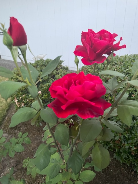 Mister Lincoln roses are looking lovely today. The other roses are cut back or are faded from the hot sun. Mister Lincoln seems to love the hot and dry.