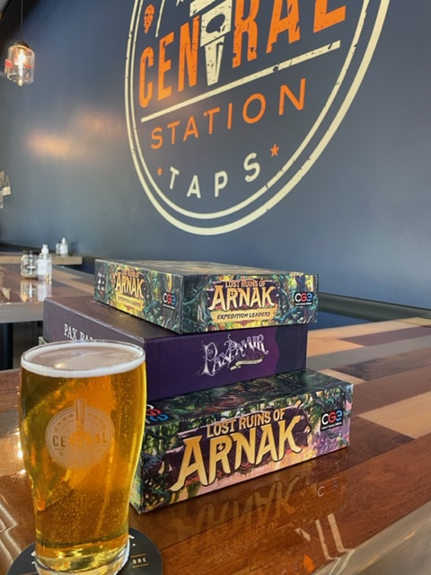 I was at Central Taps in Beaverton even earlier, meeting Evan there. Evan was limited in his time to play games. We played a game of The Lost Ruins of Arnak with Leaders, and Evan crushed me (I made the same mistake as later and focused too much on artifacts, and the cards did not break my way). I had a beer and a smaller beer as I did not want to enjoy using Air Volvo too much.