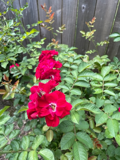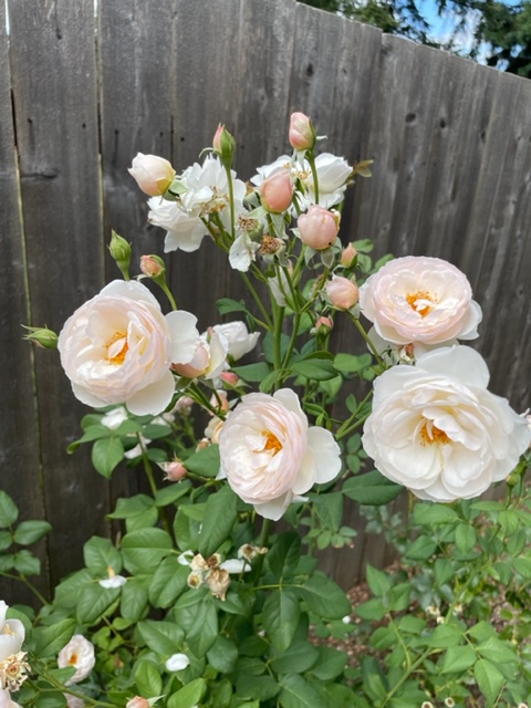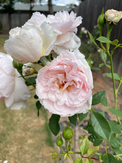 The new climbing roses, Wedgwood, and English rose from David Austin are happy.