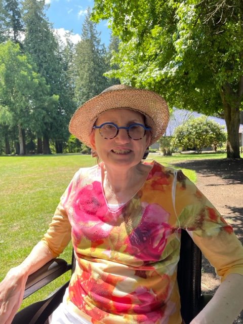 After we ended an extended call, Susie and I toured the park and got to the cedar trees, Susie’s fav, and even chatted with a few folks. I thanked the trustee of the park for putting gravel by the cement sidewalk. Apparently, he saw me popping the wheelchair onto the sidewalk, and he put down some crushed rock to smooth the way. It is much better now. We went to the exit of the park and then turned around.
