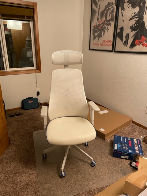 After dinner, Mariah headed out with my extra corn starch–corn starch is used to stop pet birds from bleeding–who knew? I decided to build my chair. I bought a sort of expensive gaming chair from IKEA as I again seem to be more brittle and a good chair is needed for all the writing and computer stuff. I also have floor mats from IKEA for the wheels.