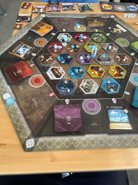 We tried a new tap house, Rain Drop, and had a beer to help pay for the table. Next, we set up the board game Vindication. It was a long game this time, and Evan managed to keep his lead all through the game, and a last-minute Monster card gave him the game by one point. Vindication has a random end-of-game trigger, and these accumulate as players score. Had I been able to trip the end-of-game sooner, I would have won with all the masteries I bought. Still, Evan played well and deserves credit for his win by collecting rewards for visiting the various cool places on the board–also randomly determined. It was hard to lose by one point. Next time!