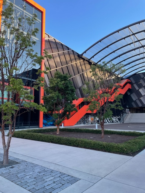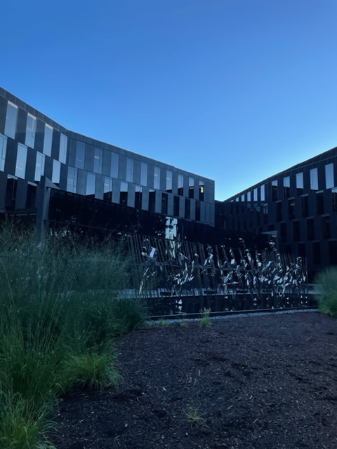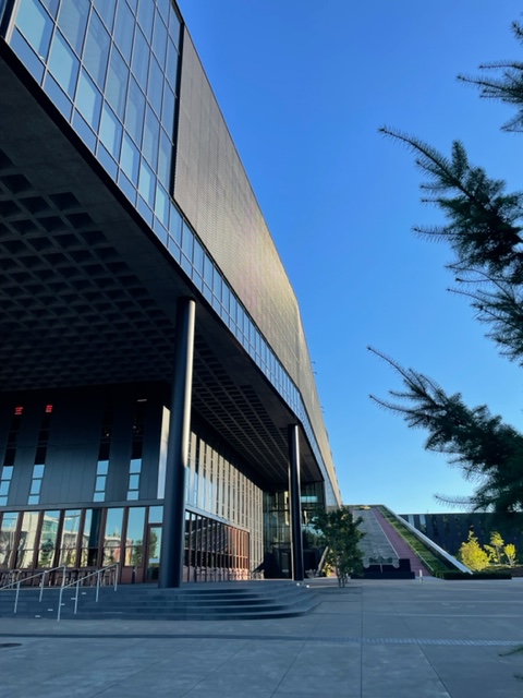 Nonetheless, it was nice to park in a parking structure and then walk on the campus. I picked the furthest new garage to walk by all the new buildings. I have not had the chance before with the pandemic and the construction. My, they are huge buildings and have a completely different color and design scheme from the older buildings. The buildings no longer seem to be a college campus–the previous theme, but a dream from LA and the Pacific Northwest. Black, orange, gray, and folded designs shout LA with water and plants that give a calming PNW feel. I love it.