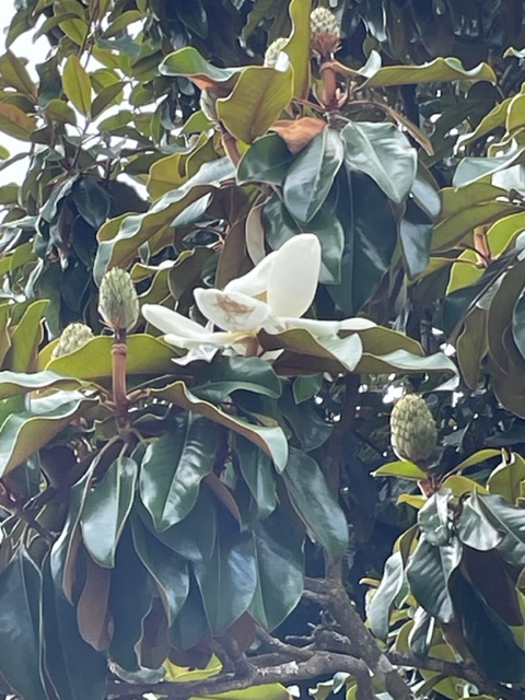 The park was lovely as usual, and we also walked some of the streets and stopped by the magnolia tree to spot a bloom. Evan found one of the plums of another tree intact on the ground and found it to be good.