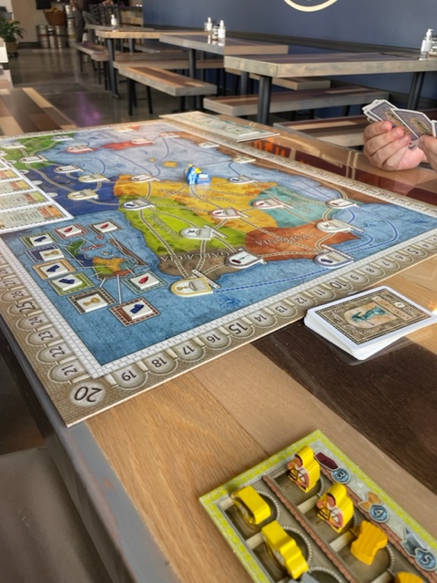 After lunch, Mariah got into her Hemi-engined orange car, growled through the parking lot, and headed off for the rest of her day. As usual, Evan and I met at Central Taps after parking in the free lot. I brought the board game favorite of mine, Concordia, and we got a table and beers–running a tab.