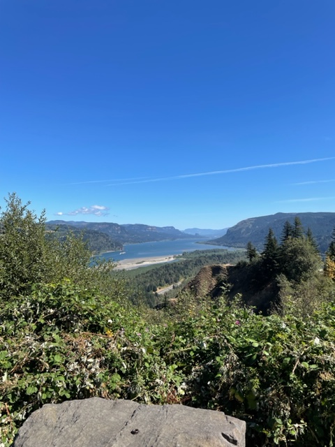 Hood River was next on my plan. We did pass by Multnomah Falls but just took pictures from the car on I-84. The Gorge is its usual impressive sight, and the fire damage from 2020 is fading, but some parts are silver with the killed pine trees. Unfortunately, the trees grew on the side of the gorge cliffs, and there was no known way to put out a vertical fire–I remembered and had to be left to burn. It was an awful year, 2020.