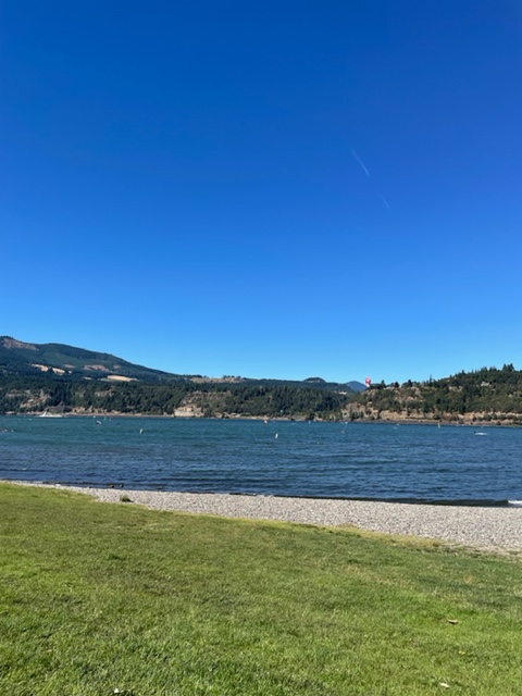 We reached Hood River in less than an hour, with traffic moving near the speed limits and often faster, so not Portland-Beaverton. I parked near the river, and we went to look and, in the case of my guests, play in the river. The new surfing thing at Hood River, the galactic center of river windsurfing (no sharks), was a kite (a sail on a post on the board is no longer done) to pull you. Smaller handheld kites for the newer and less invested and larger ribbon kites for the strong and talented. Huge rigs for the well-invested, competent, and from what I could see older folks. I noticed the vast and fantastic windsurfing was done by a gray-haired community. I pointed that out to one of the surfers as he walked by with a 12-meter wing that would look good on a dragon, and he smiled and said, “yes, it takes wisdom.”