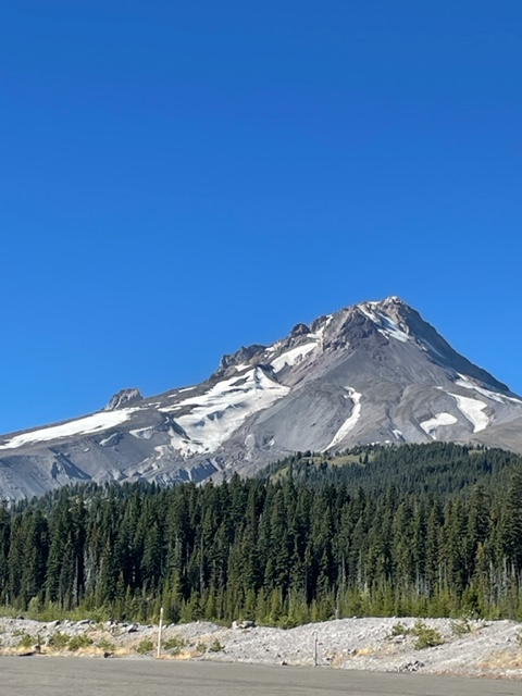 We returned to the road and soon headed over the hills on highway 35 to the volcano, Mt. Hood. I did stop a few times for photos and at a fruit stand and got some stone fruit. The valley between the mountain and the river is the prime place to get stone fruit–I have some beautiful peaches and nectarines. Twenty years ago, I remembered them having issues with cold weather, but not anymore. The Hood River supplies the water for the vast acres of fruit trees.