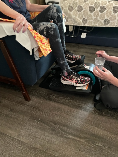 We also managed to get Susie to use the new peddles from a recliner, and she was able to peddle a bit. We can keep working on this without PT as it is not high-risk like standing. So we can get Susie some exercise now!