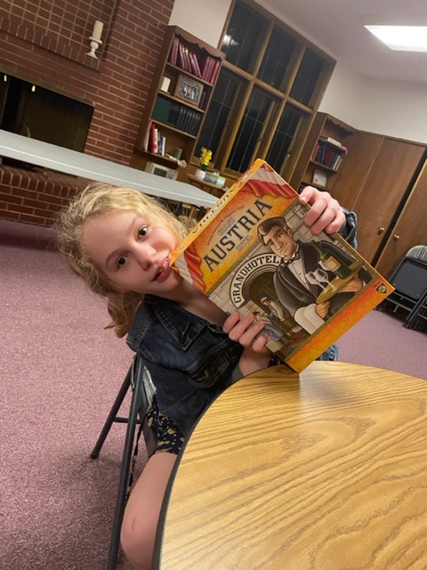 I managed to awaken at 5:20ish and was ready to head to the First United Methodist Church. I got there at 6ish, and Zophia, as usual on Wednesday nights, played board games while the band and choir practiced. I brought a harder one, The Grand Hotel Austria, which has lots of rules and a strange game flow that takes a while to get used to. Zophia was game, and we soon played without too many mistakes or redos.