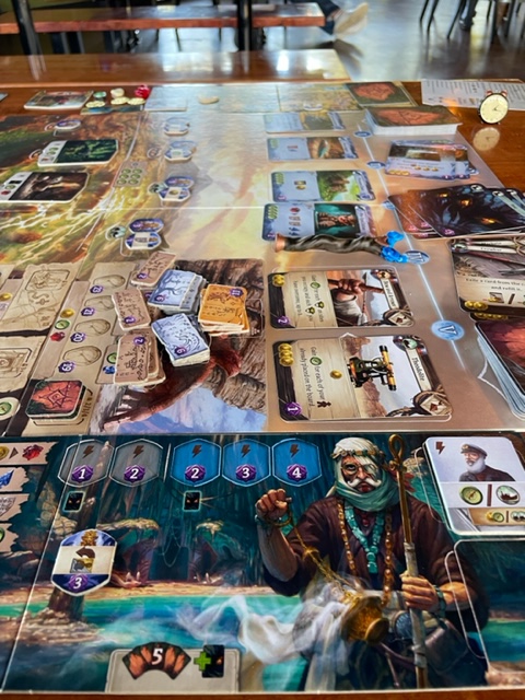 Next, we went to The 649, which also needed us to buy a beer; I had a lower alcohol product. Next, we played the board game The Lost Ruins of Arnak with the Leaders add-on. I tried out The Mystic leader, and Evan played the Falconer. I enjoyed playing The Mystic from the Leaders add-on as I had many options that play the Fear cards as a resource and not as something you need to thin from your deck. I lost by seven points as Evan managed to run up to the top of the research track. We matched nearly 1 to 1 on all the other points.