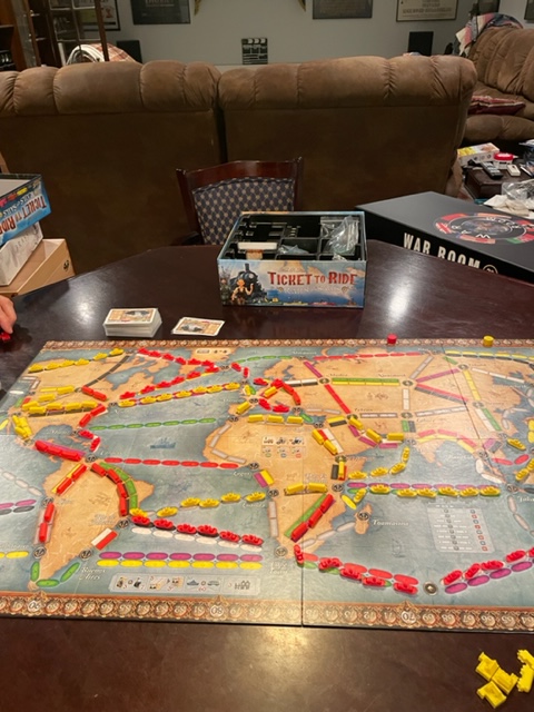 We next played a train game, also new for me, Ticket to Ride: Rails and Sails. I have never played a Ticket to Ride game as I find the train games more of party games for me and I like then Save Doctor Lucky and The Forbidden Island or, for the game-friendly crowd, Azul. Richard is on a quest to play all his games in a year, and this one got missed. We gave it a try and learned it and played it. Again this is a resource management and area control game, more my strength, and I had some lucky draws on the routes (tickets) and somehow won. I liked the game, again very light, and would play it as a filler game.