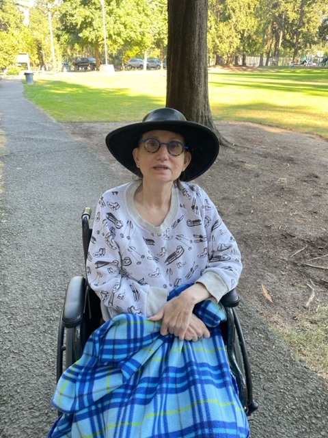 I reached the hummingbird house without any police entanglements, and Susie was waiting in her recliner. Jennifer, the nurse aide for today, popped Susie in her wheelchair, and we headed outside. We traveled through the park and called Leta, and after some re-calling, we managed to chat with Susan’s mother on FaceTime for a while.