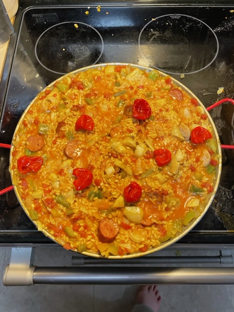 Mariah was busy unpacking, so I was free on Friday and happy to stay home and make dinner. I had collected the ingredients for a sausage, not seafood-based, Paella dish. I had the pan. Never made it before. So I chopped onions, the crying seemed to clear my head and green papers. I found fresh garlic and chopped that. I opened cans of tomatoes and artichoke hearts, and that, too, was chopped (and unneeded, I think).