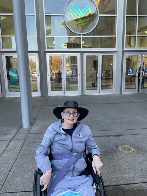 I arrived there, and Susie was ready to travel, and I managed to get Susie in the car. She was not helping much, so I had to lift her back inside the car to get her properly in the seat. More practice. We traveled the very short distance to Washington Square Mall and successfully unloaded the wheelchair (heavy) and Susie (light). The parking lot, I don’t have a handicap sign yet, is aging, and Susie bounced a bit in her chair as we crossed over the less-than-perfect surface.
