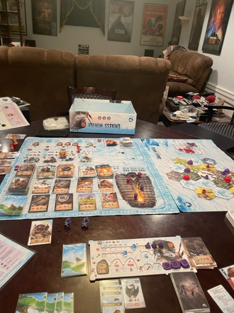 A Richards, we looked at Cthulhu Wars that I brought, but it requires three players. We picked Endless Winters, a new game in Richard’s collection. It is another well-made Kickstarter game, with Richard with more premium parts. I had not played the game before and tried to focus on just a few strategies and see if I could make that work. Unlike the board games Scythe and Architects of the West Kingdoms, this game needed you to run a balance of strategies, oops. Interestingly, my focus caused Richard to try some different ideas, and he found them highly successful–he played differently than any other play. I was crushed by a score below 100.