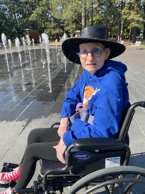 I lifted Susie again into the front passenger seat with her helping more, and that required less adjustment–better. We returned to the highway, risking 217 and arriving legally and safely at hummingbird house. I unloaded Susie; no exciting ice skating moves this time, just a stand, pivot, lift, and in-wheelchair move (Air Volvo Death Drop with no revolutions). Anessa took over, and Susie had lunch and a nap in her plans. I left, as usual, with a kiss.