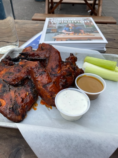 The beer was good, but Mariah was busy, so I enjoyed the book and drank a few beers slowly over a few hours. Then, at 6PM or so, I order; all of this is online (the waiters just deliver and take questions). They are the best wings there are (at least, I think so). I had medium, which is still spicy, with a vinegary hot and salty mix that mixes well with the smoked flavor and slight char. Previously, when it was FatHeads, there were signs that chickens lined up to be wings here–they wanted to be the best. I believe it.