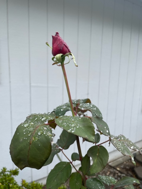 I saw that the universe relented, and my Mister Lincoln rose was about to bloom in the wet that now our weather. It looks great with all the raindrops.