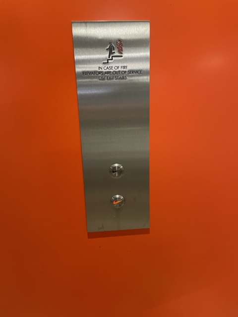 I had a bagel-like bread product with the last of my cream cheese and some canned peaches with liberal coffee from my French Press. I dressed and headed to the New York City parking garage at Nike WHQ by Air Volvo. This is an excellent place to park, and the third floor is empty at 8ish. The lights on the elevator are little swoosh symbols.