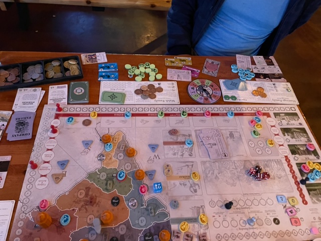 Before going to Portland to play games with Richard and Kathleen, I was at the tap room, The 649, in Aloha, Oregon. Evan and I tried our hands at another Kickstarter new game, The John Company. This game simulates the families running the East Indian Company and the plundering of India, most of it tongue-in-cheek. I have been trying to learn how to play, playing it against myself a few times. First, I set up the game with Evan’s help for four players. Two-player games require the automaton as a third player, which is a pile of more rules (yikes! There are many rules without it). Instead, we played two families each. This also allowed us to have more experience spreading out the company’s offices. In this odd game, players are randomly assigned offices that run one part of the company, trading, or the military that will start looting India and resisting rebellions caused by the same. Like most Kickstarters, the game is lovingly made and has too much going on. Evan and I had a drink and played four turns, with the turns taking as much as thirty minutes to complete. We did loot Hyderabad and had yet to start the opium trade with China (!). The game is about money and prestige.