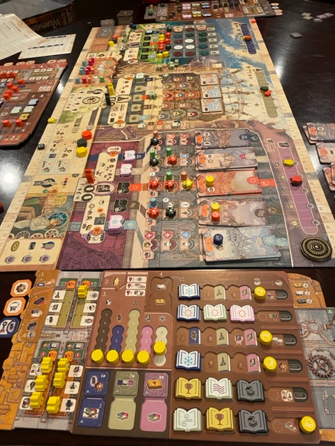 Moving back in the day, I was at Richard’s house with Kathleen to play Weather Machine. This is a new board game, Richard’s second play, and a Kickstarter game with all the premium pieces and bright colors–a Kickstarter copy is available with add-ons from The Game Stewards for $189. This is from Vital Lacerda, who made other favorites like Lisboa, and it is his masterpiece. It is enormous and has the usual mass of fiddle parts his games are known for. Kathleen thought it way to fiddle and required the player to pass through most of the game to win instead of the usual worker placement, resource management, and engine building.