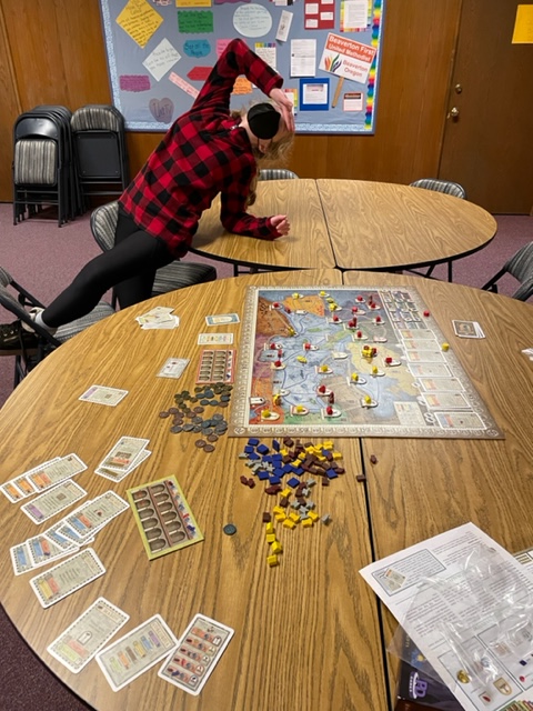 Wednesday is choir and music practice night for the church. Zophia is there, and I bring board games to play while she waits for the practice. Today we played my favorite, Concordia, and I taught the game to Zophia–it is easy rules, but the choices are hard. The game is a resource management, placement, and deck-building game. It excludes engine building, which my gaming friends so love. The theme is that you are a trading family in Rome and need to expand trade and hire/train (buy cards) folks to help you. The best trading house wins. To build a trading house, you need resources (wooden tokens for cloth, tools, wine, food, and brick) and a colonist in the area (a meeple). Plus money. You need resources to hire (buy a card). You play a card (a personality) to take action for that card. You play one card for your turn. Again, so simple–but so hard to have a plan. I often plan my turns three ahead while other players are going. The conflict is between building trading houses, buying cards, acquiring resources, and getting money. Adding to this is the complexity of getting your colonists in place and more out ( you have six). It is a newer game and so it is pretty and had expansions (none we used tonight) in the form of new boards (maps) and some new rules (the salt expansion I won’t use–but I like the Forum).