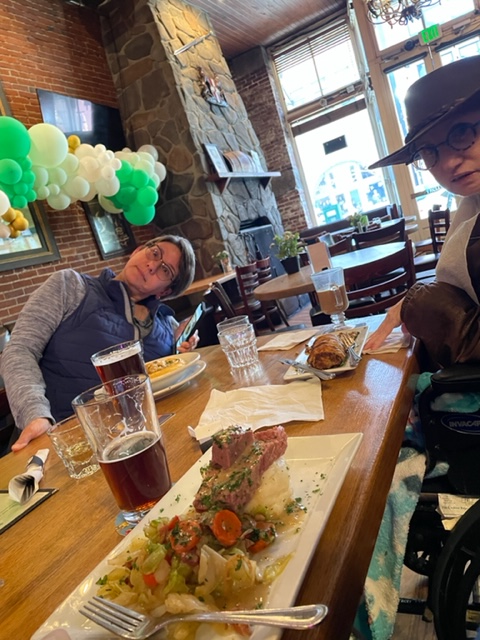 The place was not busy, and we got drinks (Susie having an Irish Coffee) and waited a bit on food. Mariah texted me, and she was coming to join us. Unfortunately, she was much delayed by heavy cross-Portland traffic (she lives in SE Portland; we were in Skidmore just across the river in SW Portland). We ordered after waiting a bit; Susie had her usual sausage roll, which we cut very small and helped her eat, Barb tried the Shepard’s Pie, and I dove into the Corned Beef platter.