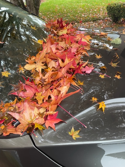 Air Volvo was buried in leaves. The garage is stuffed, so Air Volvo lives outdoors and ages a bit from that. My gutters are stuffed too. Only one tree has let go, more like a leaf explosion. The other tree is usually two weeks later. My lawn service appreciates that the trees don’t bury me all at once, but the extended leaf clearing crushes them every Oct-Nov. I remember clearing the leaves for Halloween for trick-or-treating before, so that gives you an idea of how much time the season has changed: three weeks.