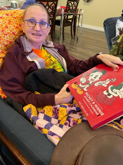 After leaving Beaverton, I headed to see Susie at the hummingbird house. Susie was in her recliner in the living room, not really watching the reruns of Friends. Jennifer planned to have the residents help her decorate their Christmas tree later in the day. I got out Susie’s Micky and Mini Mouse Advent calendar, and we together opened day two. Susie had a bit of chocolate, and as there were two chocolates, I had one too.