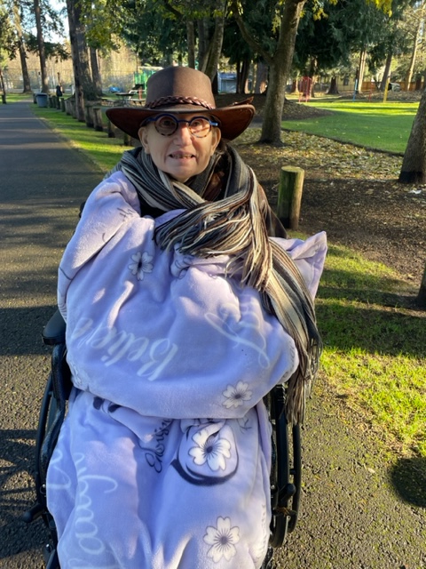 Next, I headed to see Susie and forgot to do the Advent Calendar when I got there. Susie was finishing her lunch when I got there. She was finished, actually pushing her wheelchair out. We then got Susie’s coat and headed outside to the park. I wanted to get Susie out of the hummingbird house, and I had no meetings left, so I could spend extra time doing the park.