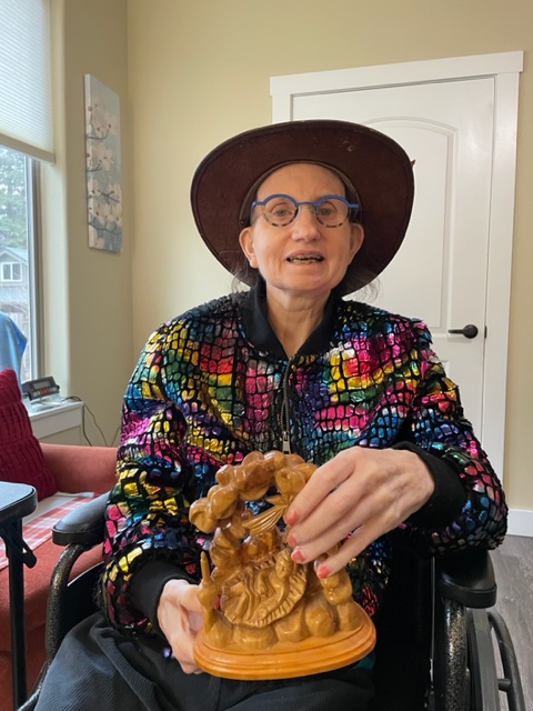 Susie was delighted to see me. I brought the Baby Jesus in the Grotto carved olive wood nativity. I think we bought this in 1994 in Israel near Bethlehem on our first-ever international trip. Susie was happy to have it in her room for the holidays.