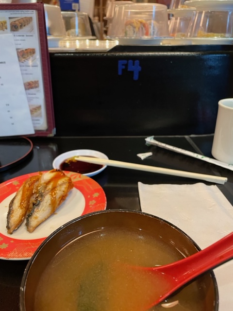 It took me an hour to return home–usually a twenty-five-minute trip. I had no lunch, and it was already 5ish. I got the mail and plugged in my laptop to charge. Next, I headed to the local sushi place, Sushi Zen, and got a place next to the track. I had miso soup, hot tea, and various raw items. The selection was limited, but I soon found what I wanted. The place filled up, and I was crowded at the counter and decided to leave. I am still uncomfortable with anyone sitting next to me that I don’t know.