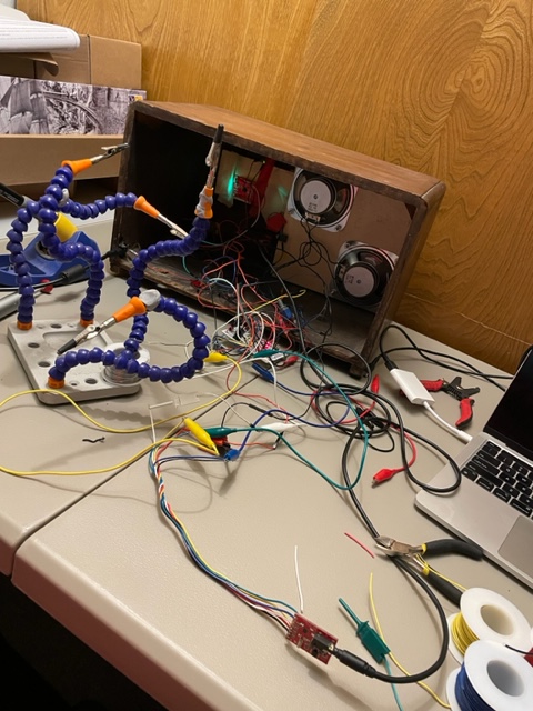 The radio connects to a station, Charlie FM–playing all Christmas music, but there is a terrible pulsing in the sound. I checked, and the speakers, when plugged into my Apple, are good–I used a universal connector for the speakers when I did the rebuild in 2019, making testing easy. The stereo amplifier is also good. The amp is another nifty breakout from Sparkfun with a nice nob to adjust volume with other options broken out if you need more control. It is based on the LM4853 Boomer® IC. This is a good choice if you need an amp for a project and want something that just works. The chip sells for about $2.50 and is an SMD package (the days of hole-through soldering are fading), but I am not ready to invest in SMD and am happy to keep buying breakouts.