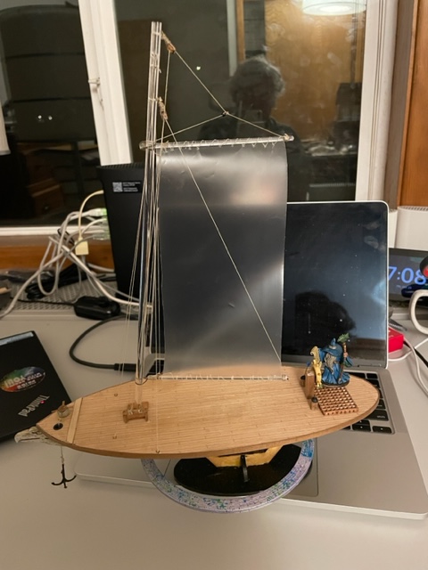 When I had a moment, I finished the Spelljammer ship by tying down the last of the rigging–it took only a few minutes but must be done with care and perfection. Last night I made a fife rail (I had to look up the name as I have not worked on sailing ship models in a while) with the premade belaying pins that I purchased some time ago. I attached that to the deck on one side of the mast. Next, I used the fife rail’s belaying pins to tie down the running rigging. Finally, I glued the SciFi ring under the skiff’s deck and glued one more piece of thin mahogany to hide the hole for the mast. The sewing of the mast last night was stressful as I had to manage it without breaking anything. The usual problem with these rigged models is not breaking the previous work while finishing something difficult. The model could use more rigging to be more functional looking, but for a model for tabletop gaming, it will more than do.