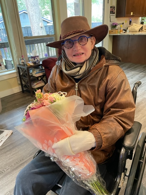 I brought Susie some flowers. Safeway again had good bouquets of flowers for sale yesterday, and I picked one up for Susie. Susie was delighted to see me and the flowers.