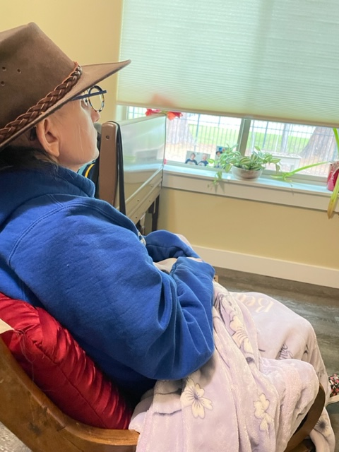 Susie was ready for lunch, and it was time, after 2PM, for me to leave. I spend about three hours with Susie on Susie until she gets lunch or falls asleep. Susie was asking for a nap, but some warm lunch first. Susie was sad when I left, and I must admit that I cried in Air Volvo. Some days are hard.
