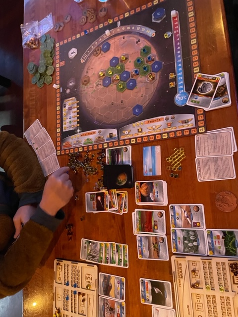We played, moving to The 649, which also was busy, the board game Terraforming Mars, which was new to Evan. I blew the rules and limited us to only two actions, an epoch and not a turn (oops), making the game easier to play and play longer. As often with these engine-building and resource-management games, time went by without even noticing, and soon we were approaching the end at 6PM! I finally, near the end, worked out what I had done wrong, and we agreed to stop. I did enjoy teaching (even when I was wrong) the game, and it was interesting this time.