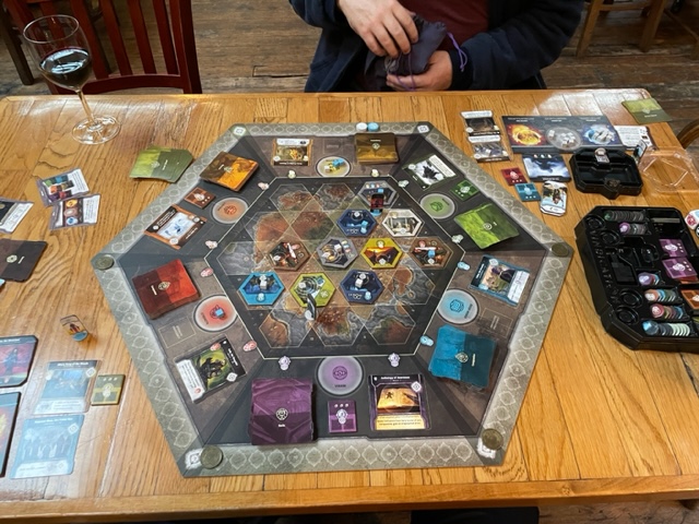 Next, we play the basic version of the hidden movement and searching game Mind MGMT. The game is played with one player as the recruiter, and the other players play agents trying to capture the recruiter. The agent players can ask some questions to try to locate the recruiter. I like this kind of game, but they are not engine-building or traitor games, so not every gamer like this style. Next, we played the training version–this kind of game has a lot of mechanics that take a few plays to get right. The Fury of Dracula, where one player plays Dracula, and the others are trying to hunt the vampire before he places more vampires, is another well-loved version that I have and have played quite a few times (now in its fourth edition that is only a few component changes (larger figures and bigger cards) than the third edition–I have the 3rd). It has multiple rule books and an obscure combat system but still a favorite. In comparison, Mind MGMT plays fast, and the rules are easy once you get used to the strange colors and words.