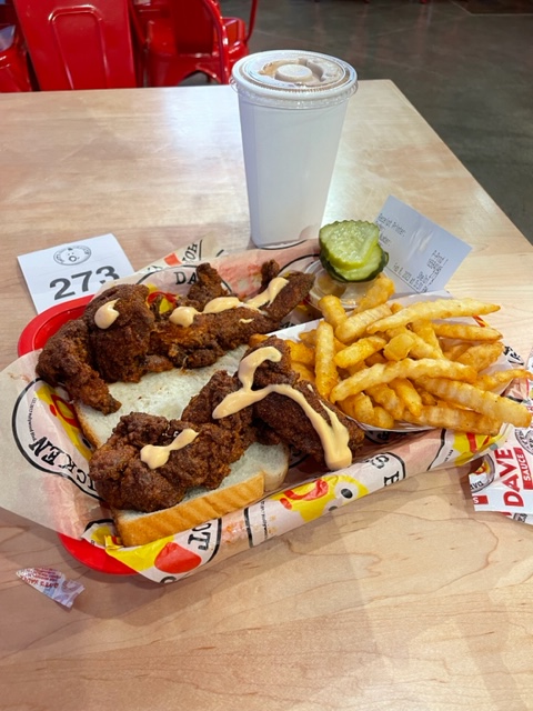 Aside: On Facebook Dave’s Hot Chicken is not an allowed place name. I was trying to post a pic of my food and could not place it at Dave’s. Unexpected. I then tried to create a place and got a message that the name was not allowed–weird. No post from me.