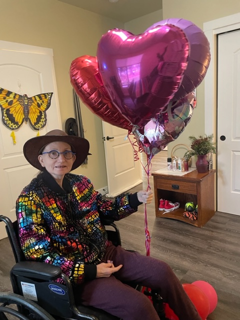 With all the loot, Susie got a collection of balloons from her mother and warm heart-covered socks from her sister; we headed to the social room to call Susie’s mother. We had a friendly chat (and called back when we found the balloons in Susie’s room) about St. Valentine’s Day and various other issues. Susie was happy and following along. I could not stay long as I was expecting trouble (it never happened) in the afternoon and soon left with a kiss.