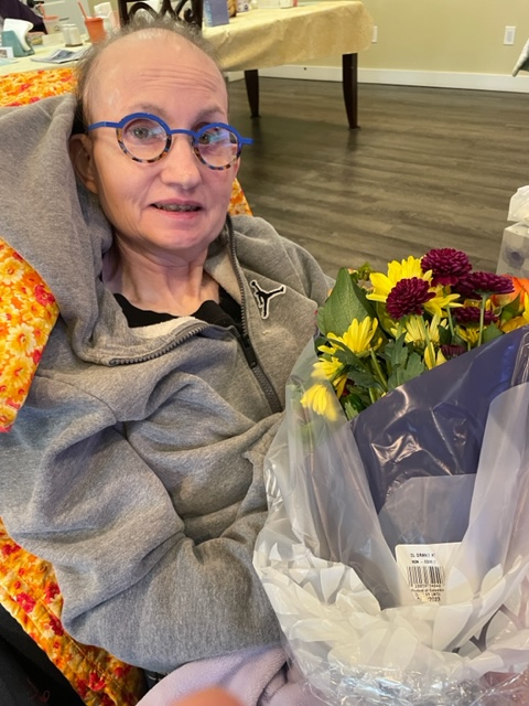 It is a work day, so my visit was short. I did have the flowers, and Susie loved getting them. She was delighted to see me after I woke her in her chair. She looked comfy, so I pulled up her wheelchair next to the recliner in the living room and called her mother on the iPhone.