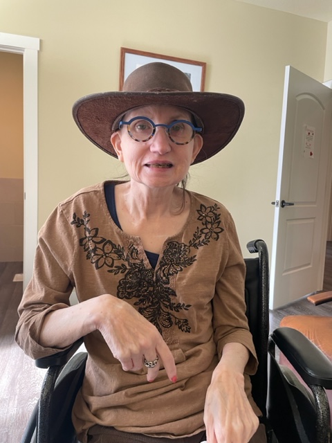Susie is finishing her breakfast when I get there. I wait while she eats; she is handling the spoon and glasses without help today. She does choke a few times, but not seriously. She finishes everything, including a glass of Ensure. We move to the social activity room at the hummingbird house.