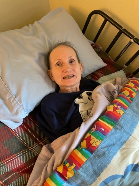 Susie was in her room lying down with her head up on her hospital-style bed, watching M.A.S.H. reruns. Susie has cable in her room and has all of the seasons of M.A.S.H. and other shows now in digital format. We watched the end of an episode, and I moved the crash pad so I could sit next to her in her rocking chair. Next, we called Leta, Susie’s mother, and they talked awhile.