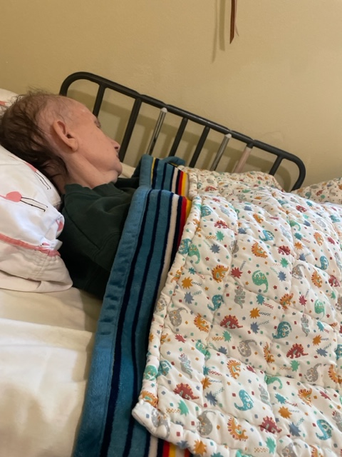 I head to Susie’s place from the post office. Susie is in her recliner in the living room, watching Judge Judy, asleep. Jennifer had to feed Susie as her right arm was not working well. Susie did not eat much and is warm to the touch but has no fever. Susie moves to her bed after we call Leta. Susie and Leta had a short call, with Susie distant or out of focus. Susie agrees to start taking Tylenol after I push her on that.