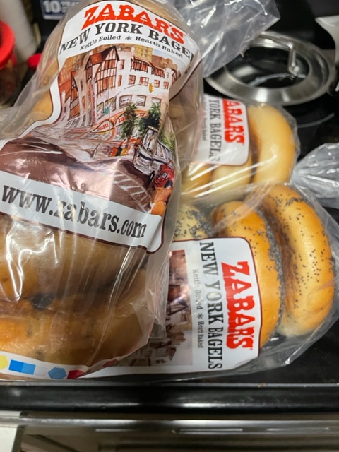 I head home after a while; I am tired. But, at the front door is a blessedly happy box from NYC Zabar’s. Bagels! Joyce Hill sent me three bags of bagels from NYC. Thanks, Joyce. I have a poppy bagel for dinner. I rest. At 10, I just need to do something.