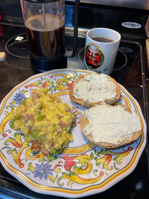 I arrived at the house in the taxi without issue and with no real traffic. I then chopped up 1/2 a fresh green pepper with 1/2 an onion. Next, I sliced up some good locally made ham from Olympic Provisions and heated all that in olive oil. Once wilted, I added egg beaters and cheese and made a Denver scramble. Next, I got out an NYC poppy seed bagel (frozen as I could not eat them all before the colonoscopy), toasted it, and covered it with cream cheese. I later added a cup of apple sauce to get a balanced meal. Finally, I made liberal coffee in the French Press.