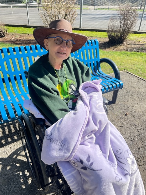 Reaching Susie’s place, I gave the soda bread to Jennifer, the live-in and weekday nursing aide, and discussed cooking corn beef for St. Patrick’s Day. This was a new experience for Jennifer. Susie waited for me to finish talking to Jennifer and was thrilled to see me. She agreed to head outside to the park. Susie was already in a green sweatshirt, and we decided that just a blanket would be enough.