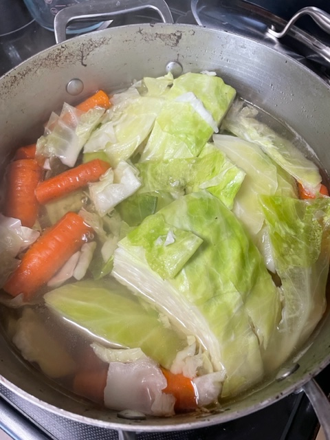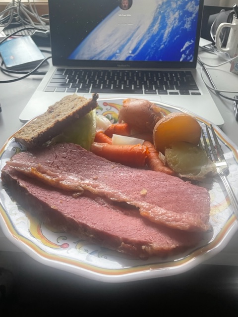 I returned by way of Safeway. I picked up a corn beef brisket, cabbage, carrots, and other items. I started the boiling process for the corned beef and put a frozen pizza in the oven. I was ravenous. I had a Zoom meeting and ate a rushed lunch. I followed along as it was Friday; there are few crises of the moment on Friday, remarkably light when we are not running data conversions (they start again soon). I continued heading back to the kitchen, mopping up spilled water when I ignored the boiling pot during the meeting; oops.