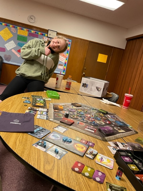 Today I played board games with Z at First United Methodist Church in Beaverton for the first time in a few weeks. We twice played the locally created board game, Vindication, each winning a game with a large point spread. Z had not remembered how to play, so the first game was a learning game. The first game-ending conditions, randomly assigned, were harder to reach, and so the game played longer. This allowed me to gain quite a lead on Z and hold it. Then, in the second came, she took the lead and stayed with it.